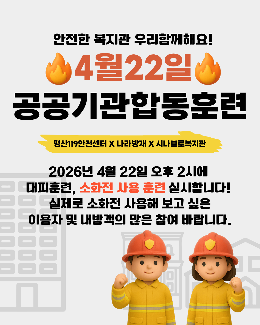 (재)양산시복지재단 시나브로복지관은 2026년 4월 22일 지구의날, 경남소방본부 양산소방서 평산119안전센터와 (주)나라방재와 함께 공공기관 합동훈련을 진행할 예정입니다.여러분의 많은 참여 부탁드립니다.문의는 기획운영지원팀 ☎ 055-781-0195